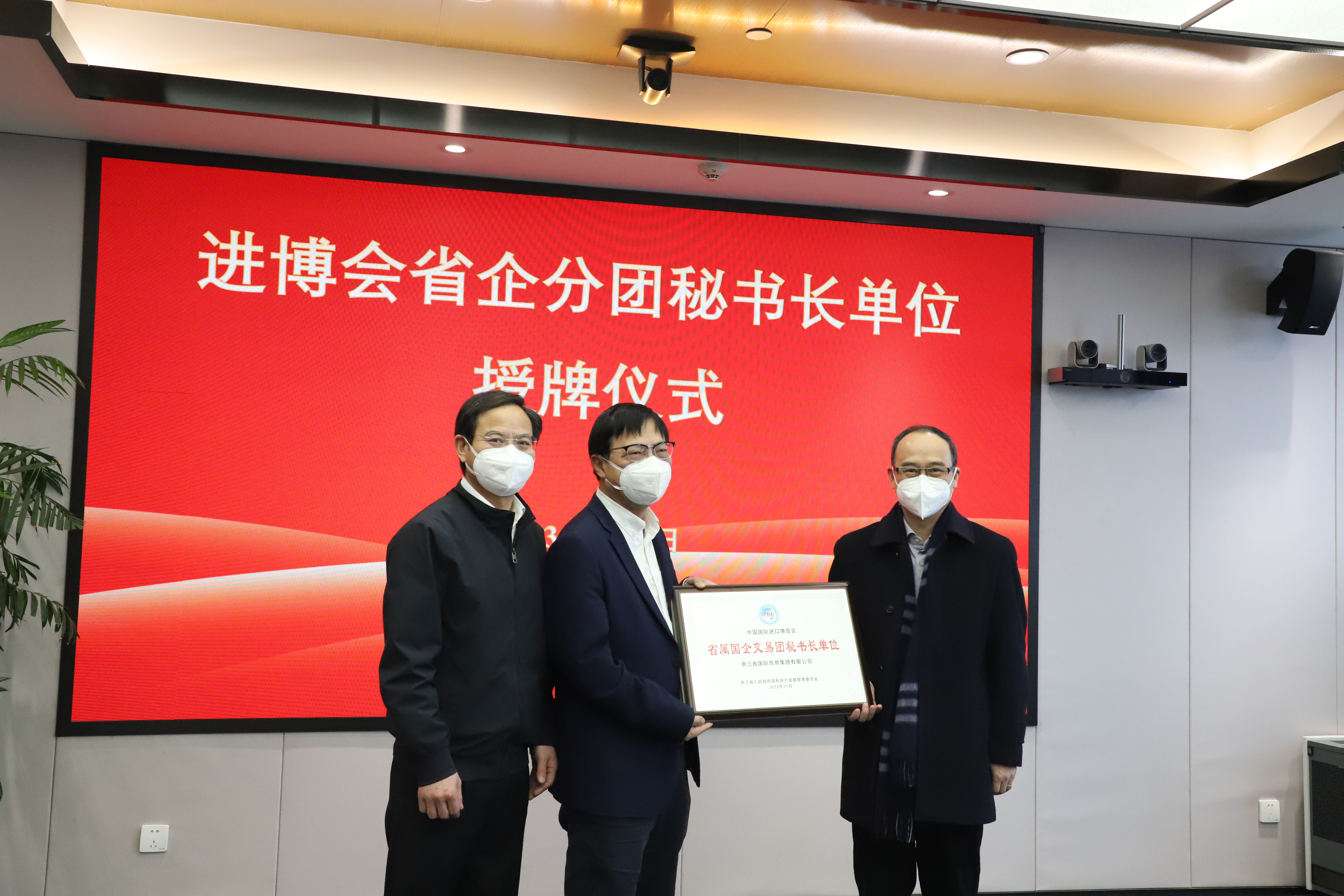 姜扬剑对集团承担进博会浙江省企分团秘书长单位的工作表示肯定,并进行现场授牌。自第三届进博会开始,集团作为浙江省企分团秘书长单位,主动担当、积极作为,认真落实省商务厅、省国资委各项部署,克服疫情带来的不利影响,在确保国贸成员企业参会成交的同时,协助省国资委组织16家省属企业高效有序参加进博会,聚力打响浙江国资品牌,赢得了省团省国资委一致好评。